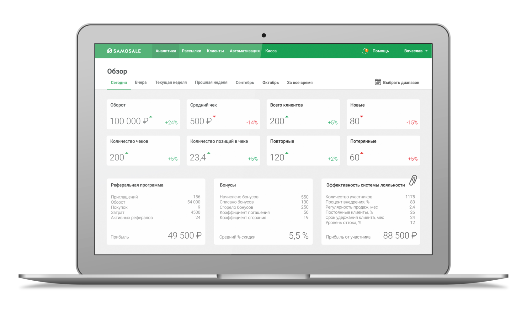 Удобный фильтр позволяет выбрать любой период и сравнить его с таким же периодом в прошлом, а цветные стрелочки покажут улучшились или ухудшились показатели в процентах